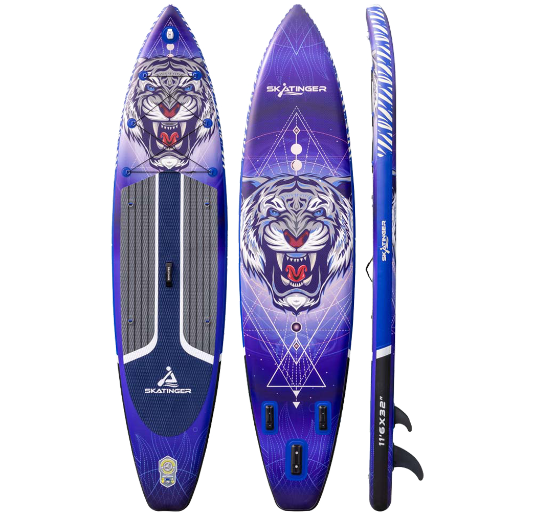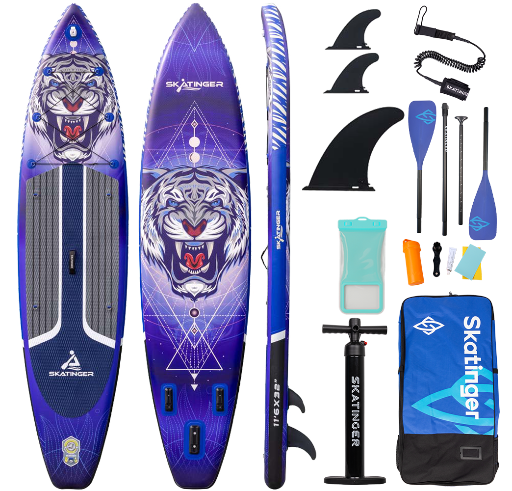 Skatinger imzalı şişme Tiger touring SUP tahtası, macera ve uzun mesafeler arayan kürekçiler için tasarlanmıştır. 350.5 cm uzunluğu ve 81.3 cm genişliği sayesinde üstün kayış, dengeli iz takibi ve yüksek stabilite sunar; göller, nehirler ve kıyı şeritlerini güvenle keşfetmek için idealdir.